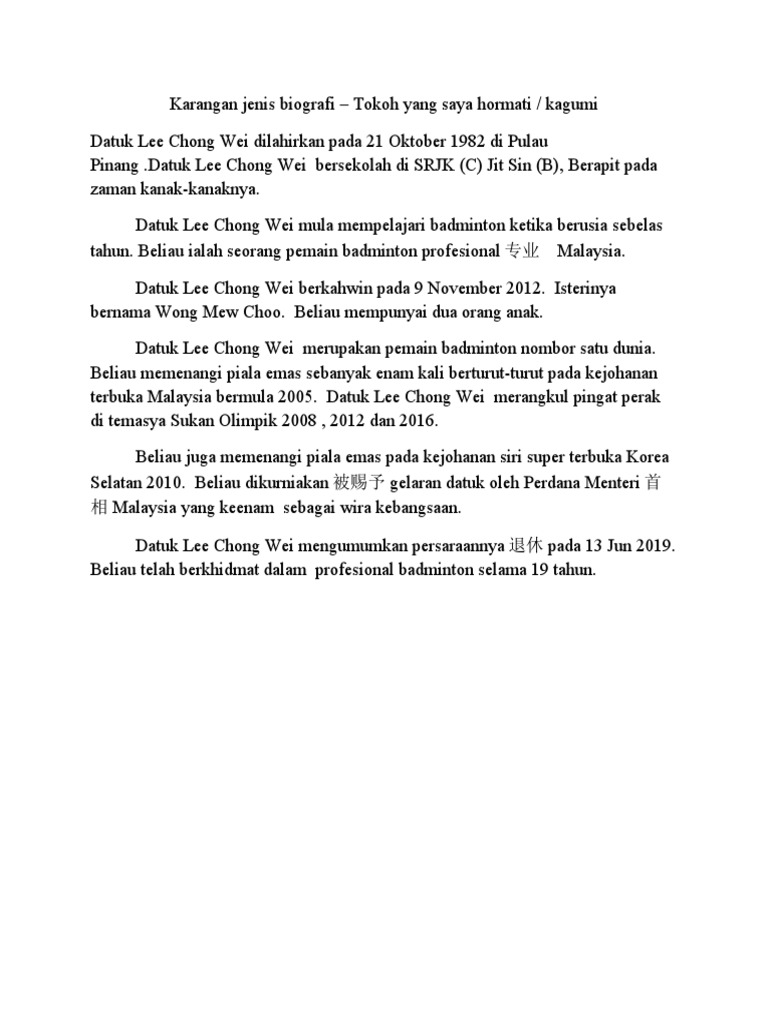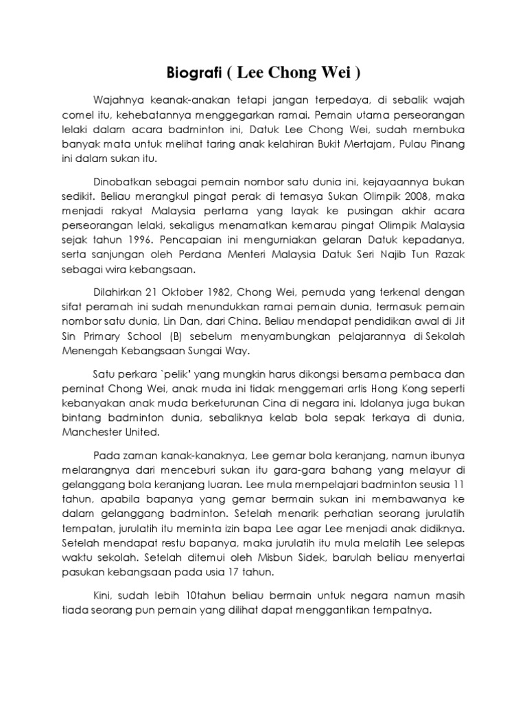 Group Essay Writing Docx The Biography Of Datuk Lee Chong Wei Lee Chong Wei Currently World Ranking Number One Badminton Player Was Conferred The Course Hero